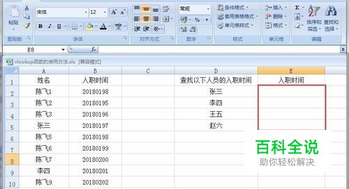 如图我准备了一张员工入职时间表,员工有非常多,如果我要在这里面一一找出张三李四王五等人的入职时间的话,可以通过查找黏贴的方式,但是这样的效率就很低了,特别是要找的人多的话,那使用vlookup函数是最简单的方法。