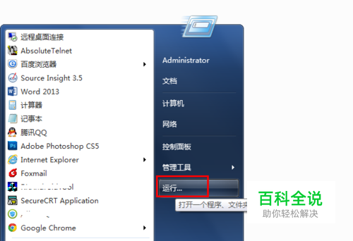 点电脑左下角的开始,然后在弹出菜单中点击运行,打开运行程序
