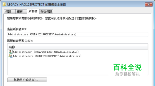 在高级安全设置中,可以看到当前注册表项的所有者不是Administrator,将所有者修改为Administrator,然后点击应用,确定。
