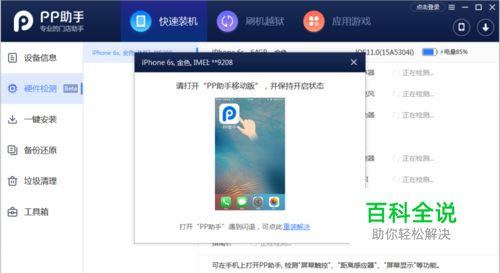 打开iphone7上的PP助手后,此时会开始进行硬件检测,保持iphone7与电脑的连接