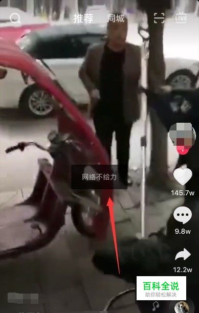 我们在打开抖音观看的时候,在WiFi的情况下播放正常,但是在没有WiFi的情况下,使用流量时,就会提示“网络不给力”,如图所示。