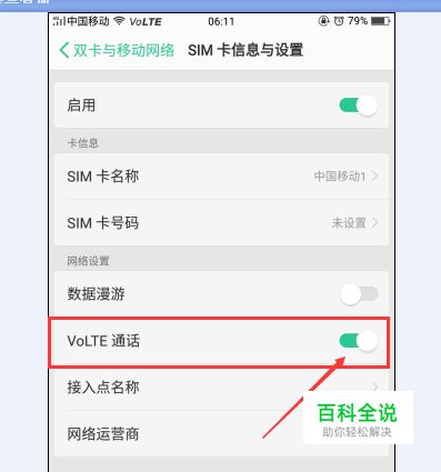 找到【VOLTE通话】选项,看到起后面的图标是绿色的,点一下。