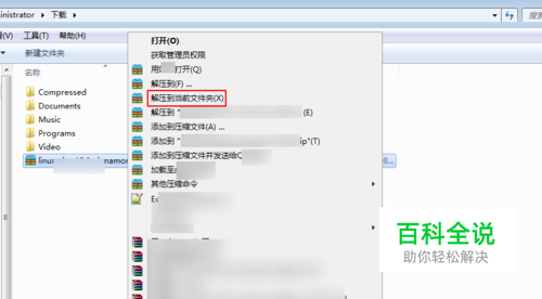 解压文件: 在windows7上面安装软件软件后,凡是它支持的压缩包都会变成一个压缩的图标。然后要解压文件,右键选择文件。选择解压到当前文件夹即可。或者解压到,解压到可以选定自己指定的文件夹。(windows10自带压缩软件不需要安装)