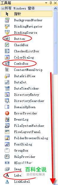 好了简单的界面就这做好了,剩下就是添加我们需要的东西了,并且实现登录功能,这需要使用控件,在软件左边打开工具箱,如果找不到,就点击软件视图,找到工具箱,点击就可以出现了。我们主要使用这几个控件 button(按钮控件),label(标签),textbox(文本框),combobox(组合框)这些控件在工具箱可以找到,工具箱如下图: