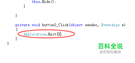下面我们创建 取消 按钮时间,即点击取消,就退出程序。双击取消按钮,在{} 里写上下面的代码:Application.Exit(); 如下图