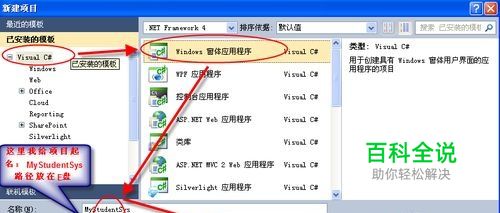 在出现的框中在框里选择window C# 再选择windows窗体应用程序,在名称里输入:MyStudentSys(我这里要做高校学生管理系统),这个名字自己可以根据需要起,尽量要有意义,下面的位置是自己保存项目文件的的目录,这里我放在E盘。整体界面如下: