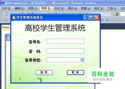 是不是发现和最上面做好的相比没有标题,我们可以再从工具箱里托一个label 表填,在Text属性里输入:高校学生管理系统, 把文字设为大一点,设置字体可以找到属性font 点击选择相应的大小和字体类型,最后实现如下图的效果: