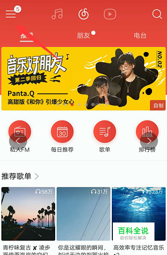 首先打开网易云音乐,点击左上角三条横线组成的按钮。