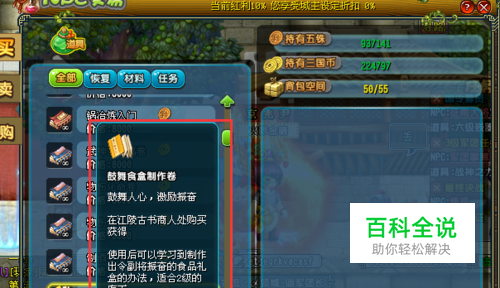 中华食谱下卷【15级】,制作黯然销魂肉、杜康酒以及通络丹,在【江陵】古书商人处够买,费用为50W三国币。