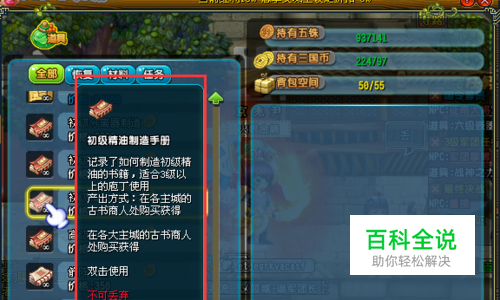 高级精油制造手册【6级】,制作高级精油,在【成都·子城】、【洛阳·青龙区】、【建业·商埠区】等地的古书商人处购买,费用为8K三国币。
