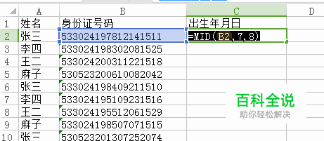在我们录入大量人员信息时,如何从大量身份证中得到此人的出生年月日呢,下面我们分享一下利用mid函数来提取身份证中的年月日。