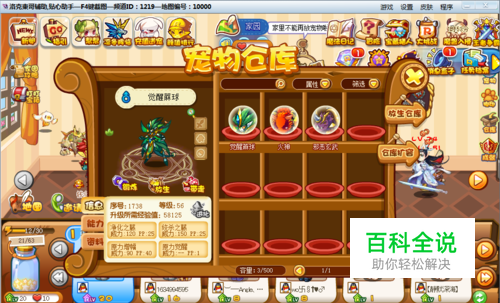 以这只觉醒藤球为例,现在是56级,把它从仓库带走设为首选。