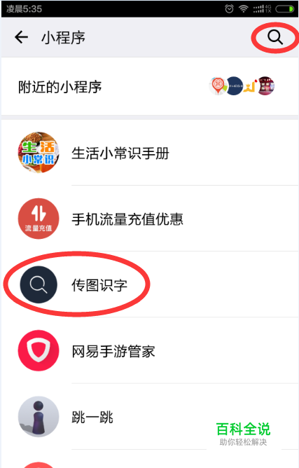 进入小程序界面,点击【传图识字】 小编这里是用自己手机截的屏,所以之前就已有【传图识字】,一般没用过的不会在小程序列表中显示,则此时可点击右上角的“放大镜”图标,进行搜索“传图识字”
