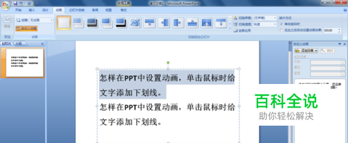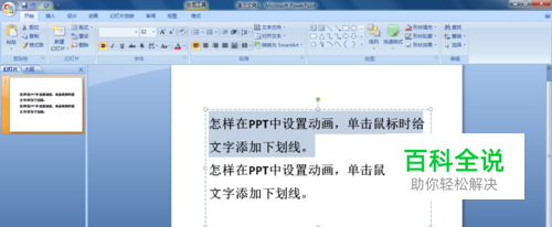 在PPT演示时为了强调某部分文字,可以给这部分文字添加自定义动画,单击鼠标时在文字下面出现下划线。下面请分享在PPT2007中设置添加下划线动画。