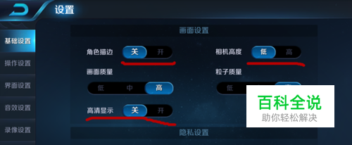 首先是基础设置,角色描述关了,然后像机高度推荐选低,这样游戏会流畅一个高度。高清显示也关了。