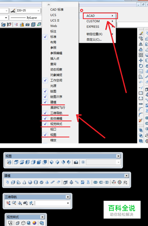 在工具栏上右键,将鼠标移到ACAD上。在弹出的菜单中依次选择建模、三维导航、实体编辑和视图选项。如图所示。