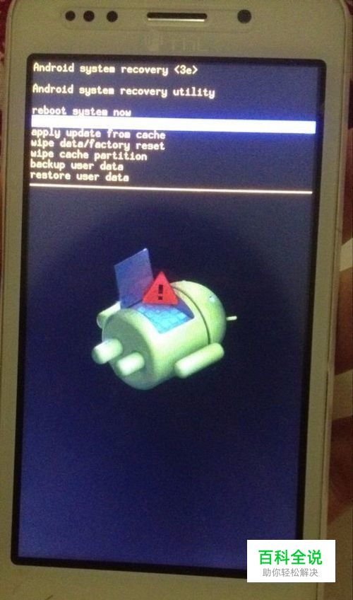 出现以下画面(各种手机有英文/中文之分) Reboot system now 现在重新启动系统 Apply update from adcard从adcard应用更新Apply update from cache 应用更新的缓存 wipe data/factory reset 清除数据/工厂复位wipe cache partition wipe隐藏总谱 backup user data备份用户数据 restore user data 恢复用户数据。