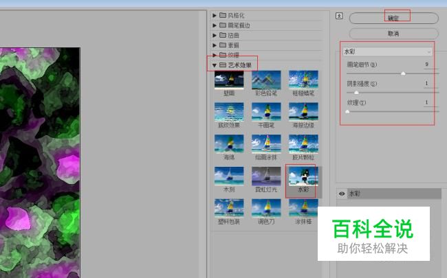 下面,在滤镜库里面找到“艺术效果”里面的“水彩”,选择并设置如图所示参数。
