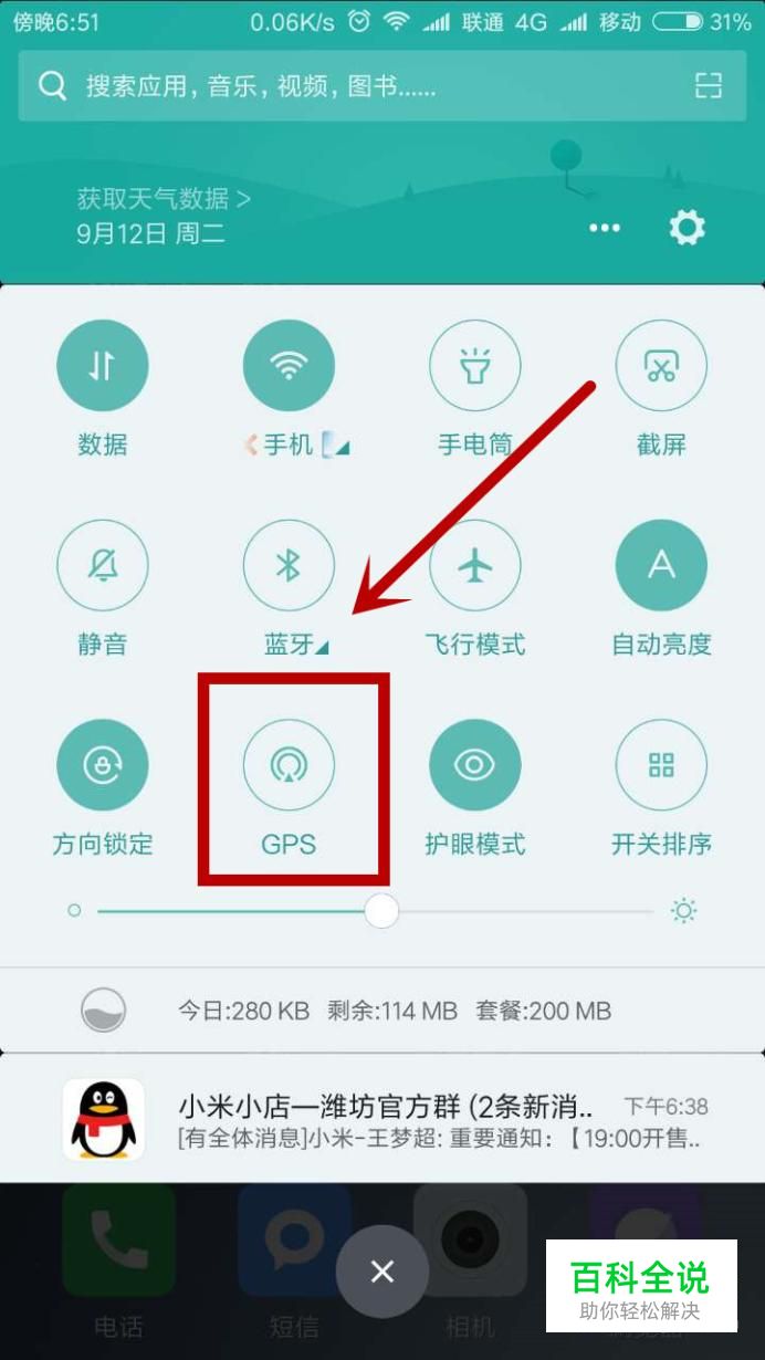 手机滑到快捷设置界面,找到“GPS”,点亮GPS按钮,如图所示~