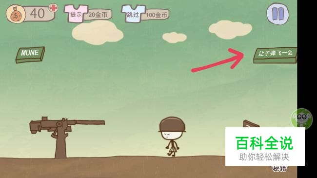 史上最坑爹的游戏第19关:将【MUNE】拉到左边,右边会出现【让子弹飞一会】,点击机枪之后,快速点击【让子弹飞一会】,即可通关。