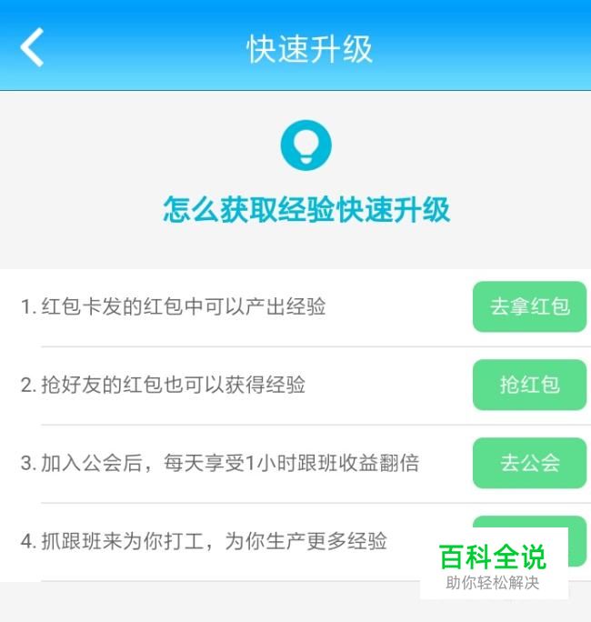 如图所示为可以获取经验快速升级的方法,比如红包会产出经验,抢好友红包、抓跟班为自己打开等都会获得经验。
