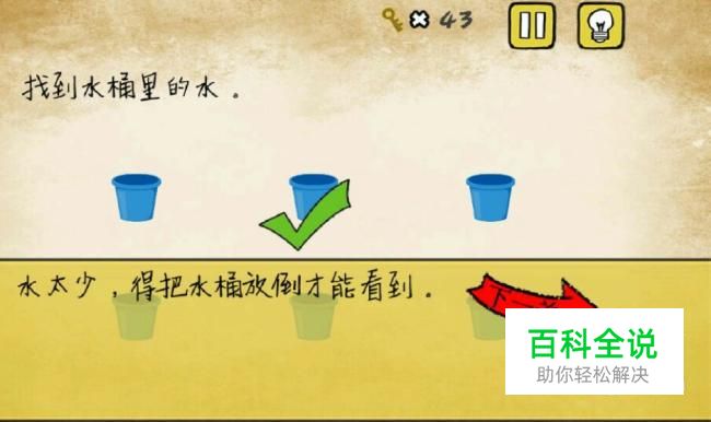 第十关至第十二关。 下图是第十关到第十二关。第十关直接将手机旋转180度,方向就变动啦! 第一十二关也是将手机转动180度,水就会从木桶里倒出来,我们就能找到木桶里的水啦!