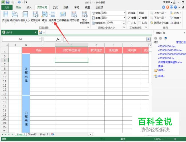 如果要进行分页打印的话首先要给Excel设置分页。打开文件表格之后先选择分页符开始分页。