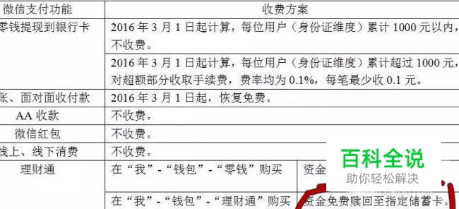首先我们先来看一下,微信的体现功能的具体收费标准,下面有我用红笔标记的请大家注意看下,资金免费赎回至储蓄卡就是说可以提到卡里。下面我简单来介绍一下这个方法