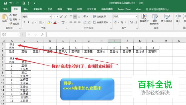 这里有表1和表2两个表,表2是将表1由横排变竖排得到的