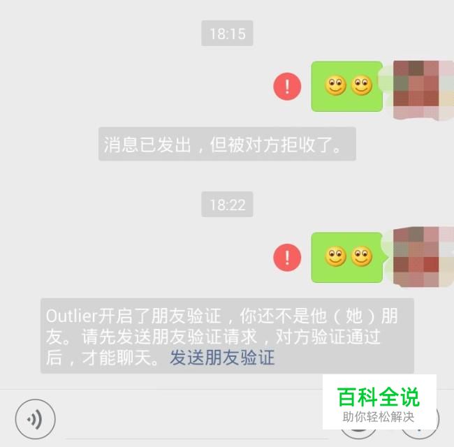 打开通讯录向该好友发送消息,如图,如果系统提示 消息已发出,但被对方拒收了 则表明被对方拉黑;如果系统显示 对方开启了朋友验证,需要发送朋友验证请求 则表明被对方从通讯录删除。