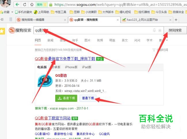先在浏览器搜索:qq影音,点击普通下载,下载好,点击打开并且安装好。