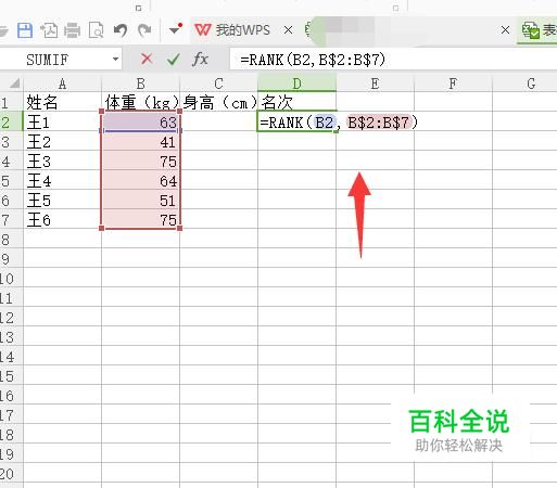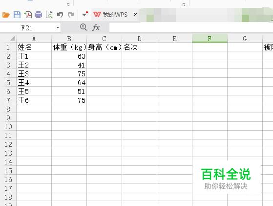 打开excel表格,可以看到里面有体重和身高的一些数据。现在 对他们从高到低进行一个排名次。