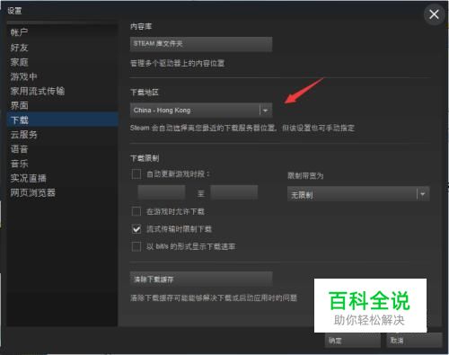 .然后你可以在里面选择不同区域的服务器然后重启Steam试试下载速度。一般情况下是先选择国内的网络,比如香港,都应该是最稳定最快的。基本可以飙到2M/S 但是这个也是因人而异。总之先把中国的服务器试完了都不行再试国外的。国外推荐美国 韩国 日本 澳大利亚