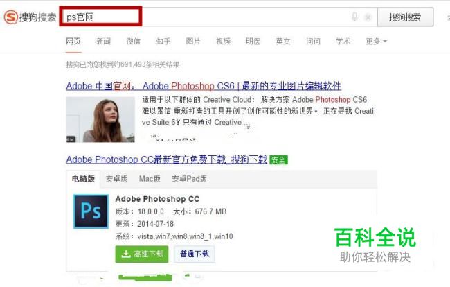 首先我们在浏览器上输入“PS”相关的信息,搜索PS下载的地址,如图所示。