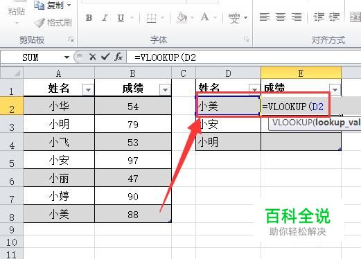 在右边小表格,小美的成绩一栏中输入【=VLOOKUP(】