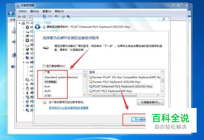 键盘 在弹出的【设备管理器】窗口中,找到【键盘】,难道点击旁边的三角形,会弹出3个选项,选择第三个【PC/ST Enhanced PS/2 Keyboard】,如下图所示:
