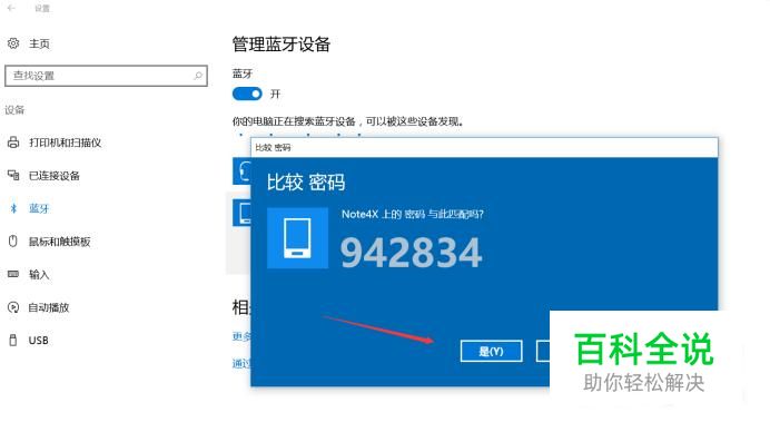 其他蓝牙设备打开蓝牙功能,电脑就会搜索到该蓝牙,搜索到以后点击配对即可。