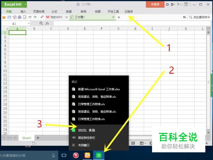 然后我们关掉第二个工作簿(1),找到电脑桌面底部的wps图标并且点击右键(2),再点击 WPS表格(3)