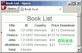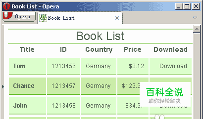 搭建HTML结构 首先确定表格的HTML结构,代码如下: <table summary="book list"> <caption>Book List</caption> <thead> <tr> <th >Title</th> <th >ID</th> <th >Country</th> <th >Price</th> <th >Download</th> </tr> </thead> <tbody> <tr> <th>Tom</th> <td>1213456</td> <td>Germany</td> <td>$3.12</td> <td>Download</td> </tr> <tr class="odd"> <th >Chance</th> <td>1213457</td> <td>Germany</td> <td>$123.34</td> <td>Download</td> </tr> <tr > <th >John</th> <td>1213458</td> <td>Germany</td> <td>$34.37</td> <td>Download</td> </tr> <tr class="odd"> <th >oKathleen</th> <td>1213459</td> <td>Germany</td> <td>$23.67</td> <td>Download</td> </tr> </tbody> <tfoot> <tr> <th >Total</th> <td colspan="4">4 books</td> </tr> </tfoot> </table> 这个表格中,使用的标记从上至下依次为<caption>、<thead>、<tbody>和<tfoot>。