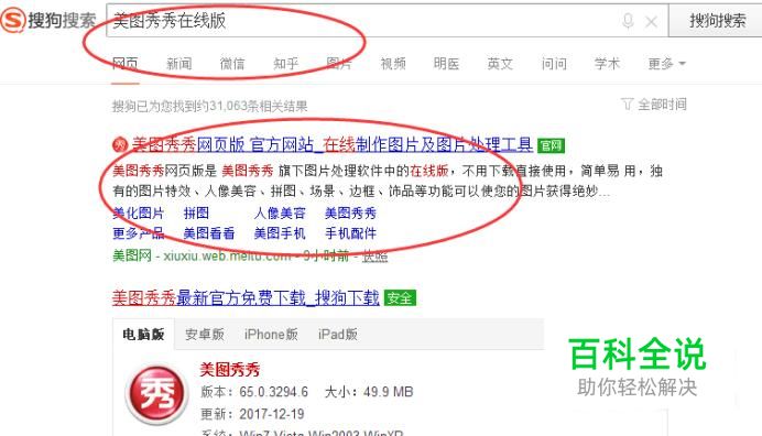 美图秀秀在线版 在浏览器地址栏中输入【美图秀秀在线版】,然后点击含有官网标志的链接,如下图所示: