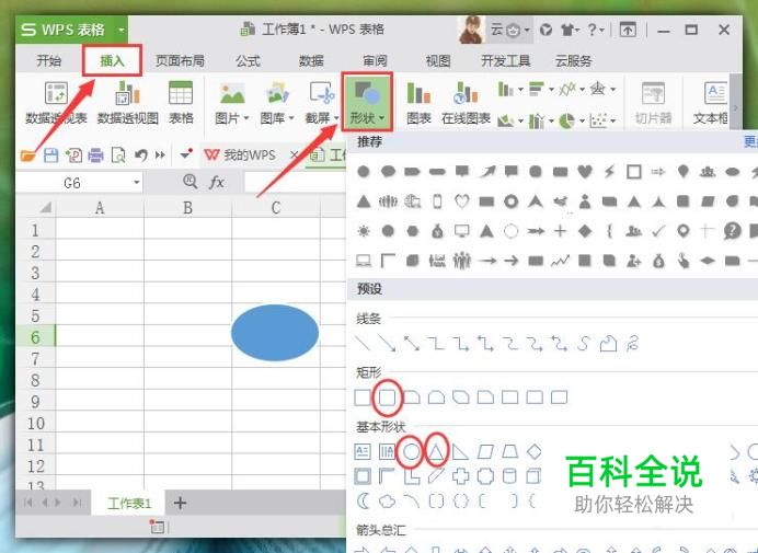 进入表格主界面后,在上方菜单栏中选择“插入”选项,然后在其子菜单栏中选择“形状”工具,在新弹出的各种形状符号中,选择一个“椭圆”符号为例,如图所示: