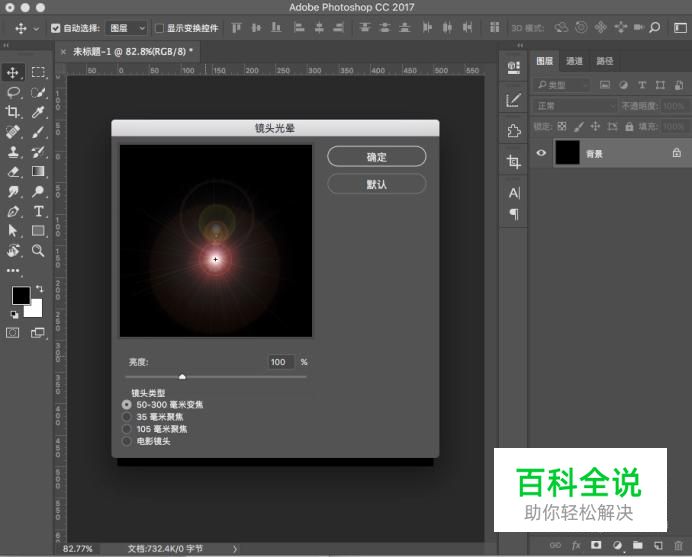 在上方选项中点击“滤镜-渲染-镜头光晕”,将中心点移动到下图图示位置,类型为50-300mm,点击“确定”