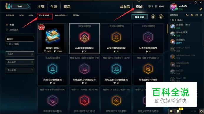设置英雄符文,首先我们需要购买合适的符文。我们登陆并且进入到游戏客户端页面,在客户端页面的右上方选择“商城”,在商城页面上方点击“符文和加成”。