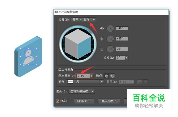 接着,选择联系人图标,再次点击“效果-3D-凸出和斜角”,位置仍为:等角-右方,凸出厚度为:0pt,确定。