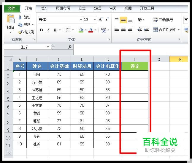 首先,新建一列辅助列,并给辅助列命名。这里我们新建F列为"评定"列。