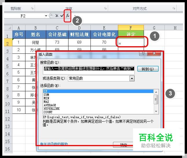 选中F2单元格,点击编辑栏的Fx按钮,使弹出"插入函数"对话框。