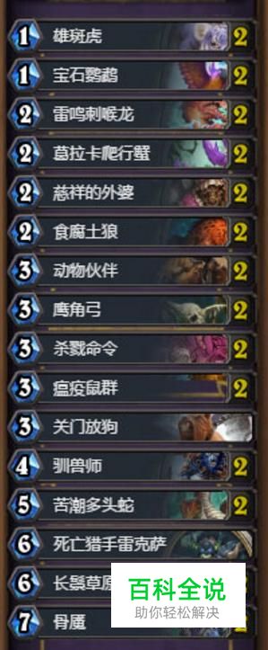 打法分析:起手找雄斑虎,雷鸣刺喉龙,如果三费能接上动物伙伴那就是猎人最强开局,基本在前期就没有对手,而中速猎的中期由于有狮子等超模随从而异常强大,后期我们也能变身dk有所保证,只要牌序来的合理,中速猎基本上是最强卡组了。