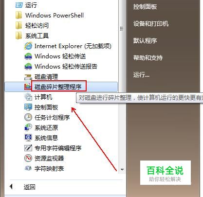 在弹出的菜单列表中依次执行“所有程序”-“附件”-“系统工具”-“磁盘碎片整理程序”