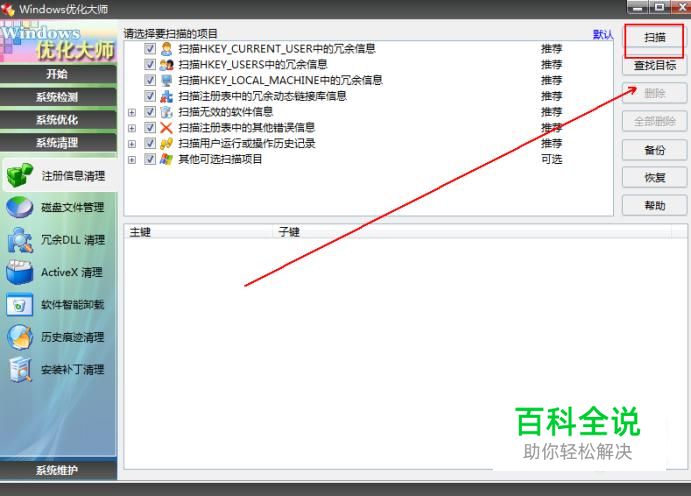 “windows优化大师”中点选“注册信息清理”选项。