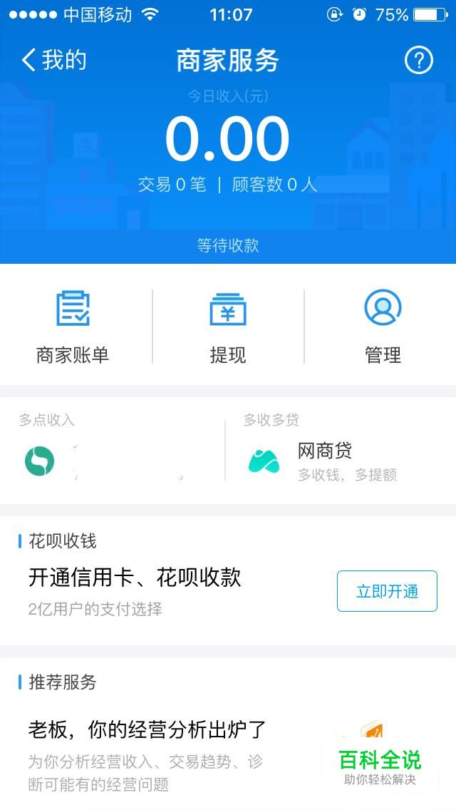 这个时候,你在商家服务里面可以看到收入、交易以及顾客数、账单等信息。